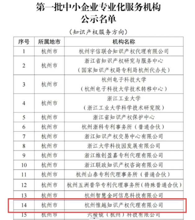 喜報(bào)!!關(guān)于杭州惟越知識產(chǎn)權(quán)代理有限公司入選浙江省首批中小企業(yè)專業(yè)化服務(wù)機(jī)構(gòu)的公示